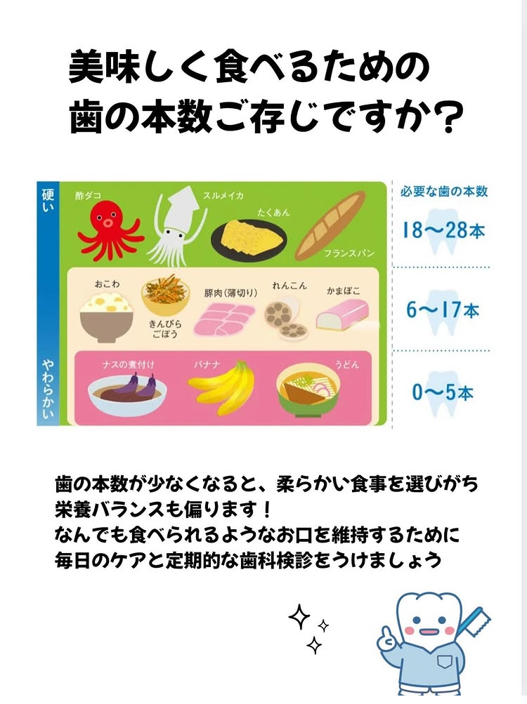 20本以上の歯があると、フランスパンやたくあん、酢蛸、スルメイカなど、歯ごたえのある食材を問題なく噛むことができます。しかし、歯の本数が減ると、徐々に食べられるものが制限されていきます🥖