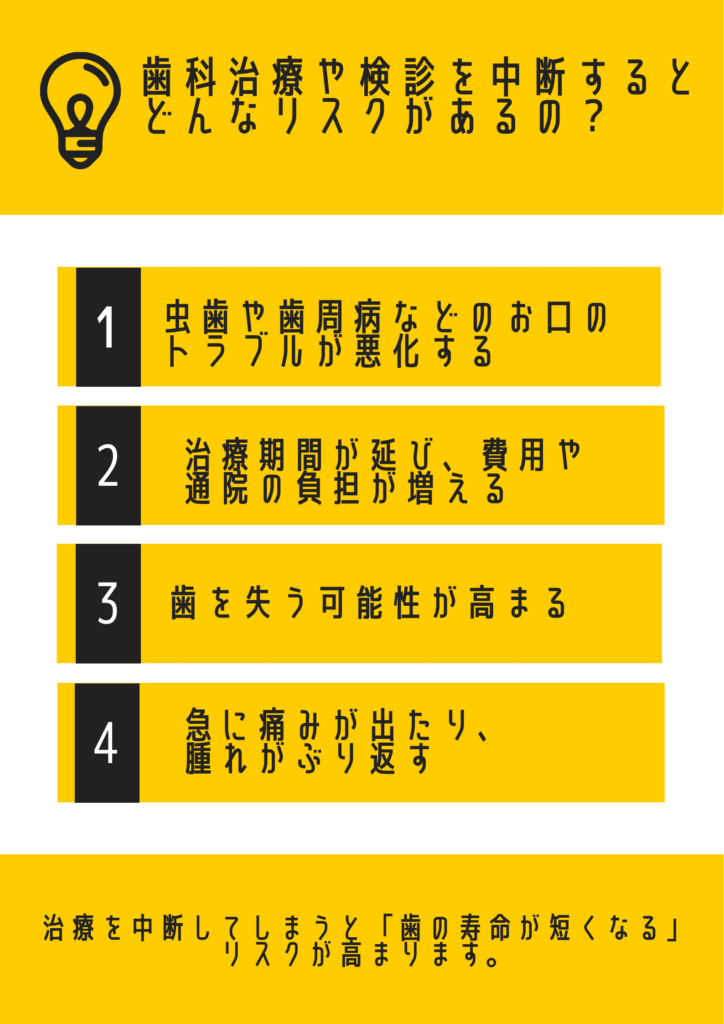歯科治療や定期健診を途中でやめてしまうことは、お口やからだの健康に様々なリスクを引き起こす可能性があります。お口の健康はインフルエンザや新型コロナウイルスなどの感染症対策にも繋がりますので、今回ご紹介する内容に心当たりがある方は、年末年始忙しくなるその前に通院を再開してみてはいかがでしょうか🙂
