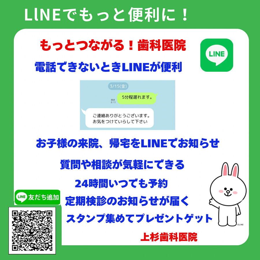 また、事前のリマインダーもLINEでお送りすることができますので、ぜひご登録下さい☺️メッセージの送受信もでき、少し遅れそうな場合や、お子さまひとりでの来院の際など連絡手段としてお使い下さい🙂10回ご来院頂くとキシリトールタブレット差し上げております🍬